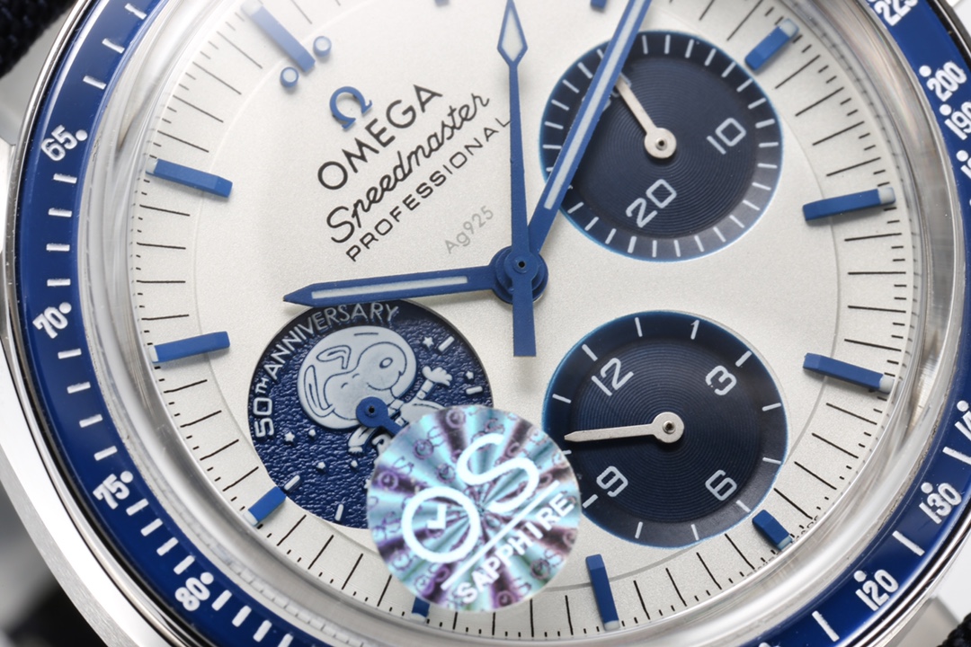 OS廠歐米茄史努比50周年款錶盤上面也有經典的藍色pvd裝置,再加上塗有夜光塗料的原因,在晚上看錶讀時的時候也不會受到任何的影響,能夠清楚地讀取數值。鏡面採用的是藍寶石水晶鏡面,不僅能夠清楚的讀取時間,更是一款非常耐磨的手錶