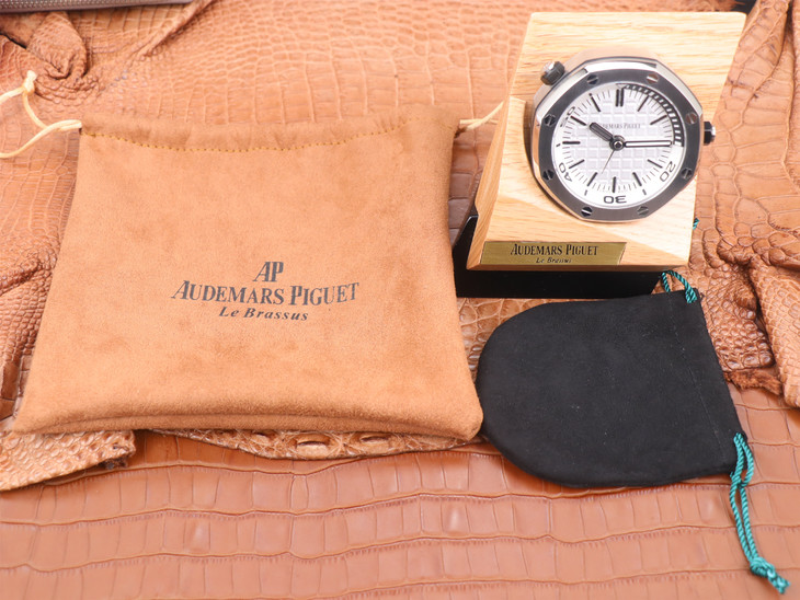 TZ廠愛彼皇家橡樹繫列15710款專賣店座鐘/小桌鐘,辦公室、書房、駕駛室的靈魂點綴。購置原裝開模,和原裝一樣為65mm*26mm規格,深度還原15710的格紋字面和顆粒效果,一比一比等比放大字面,字面填油和內影工藝,進口石英機芯,夜光指針,實心316L精鋼打造,重量同等於原裝,做工絲毫不遜色於原裝。可放置在實木木托上,亦可獨立背部支撐。