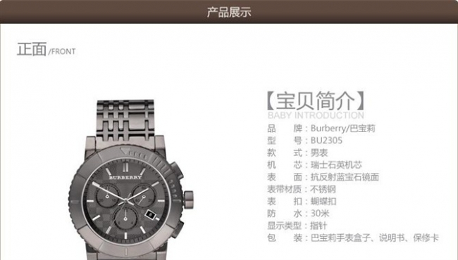 博柏利Burberry 三眼計時石英男錶 海溝計時佈朗計時碼男錶 BU2305¥1250 郵箱:[email protected] Wechat(微信):V2928124168 博柏利Burberry 三眼計時石英男錶 海溝計時佈朗計時碼男錶 BU2305 款式 男錶 手錶機芯 石英 錶盤顏色 灰黑色 錶盤直徑 45mm 錶盤厚 11mm 錶帶顏色 灰黑色 錶鏡材質 礦物玻璃 錶帶材質 不銹鋼 錶扣方式 蝴蝶扣 防水深度 100m 錶盤形狀 圓形 錶盤尺寸