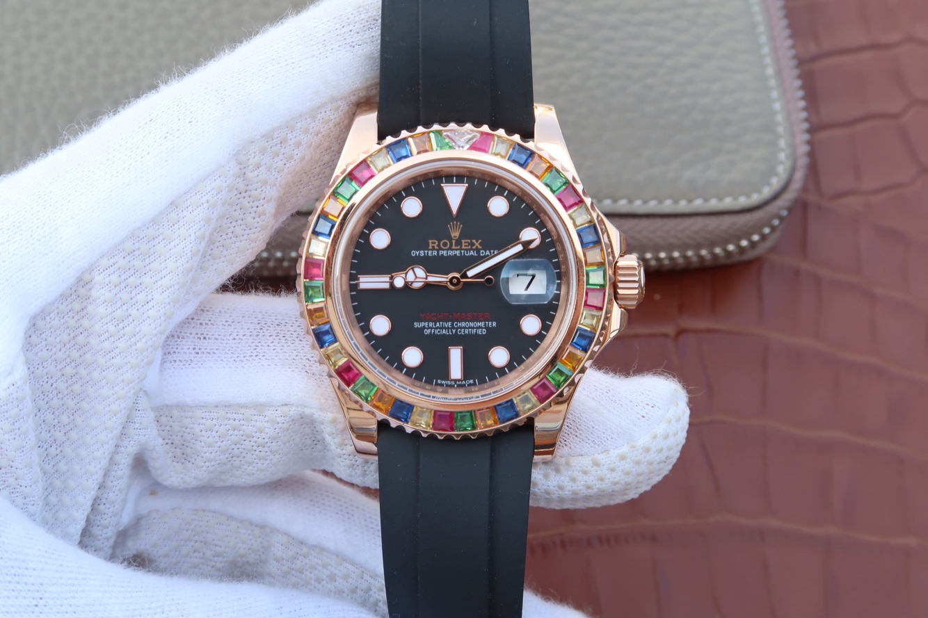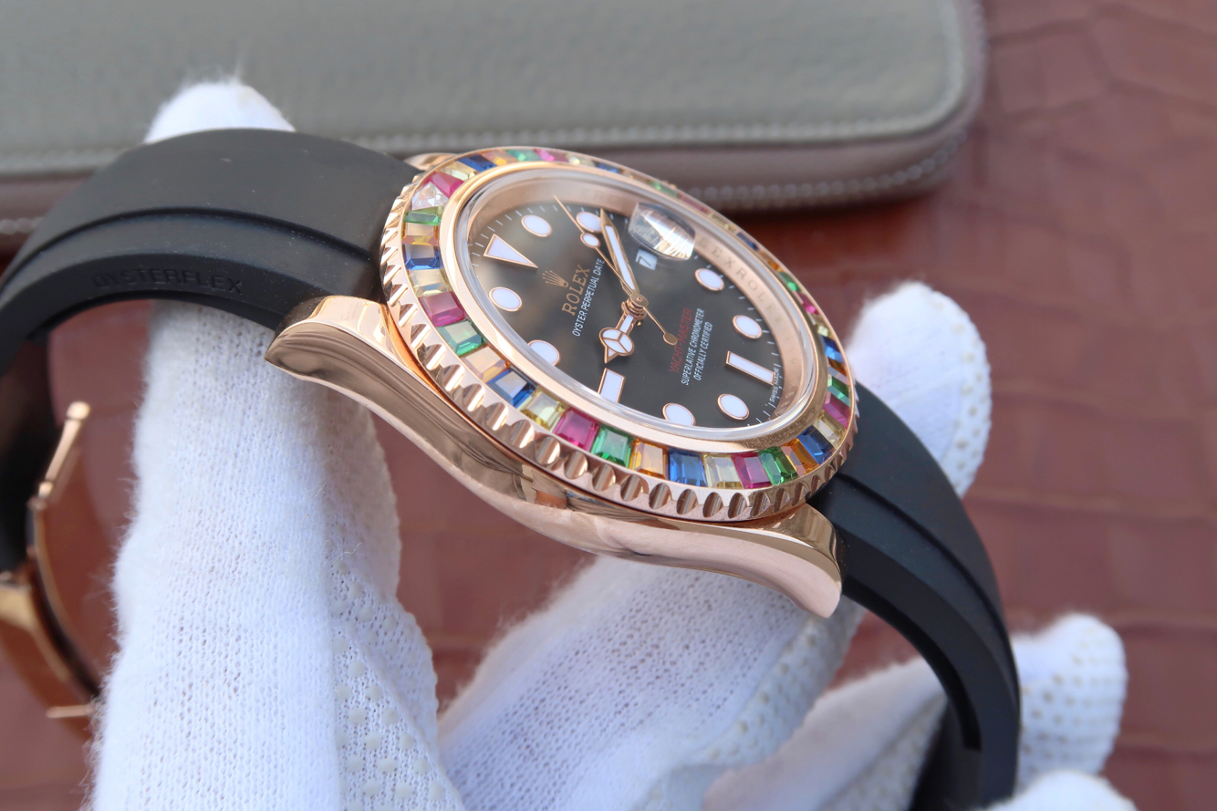 N勞力士遊艇名士型繫列116695SATS糖豆彩鉆。2836瑞士自動機械機芯,40毫米直徑,男士。歐洲訂制版高仿手錶版 2017年瑞士巴塞爾鐘錶展新款”糖豆”圈勞力士遊艇,116695SATS,史上精湛的彩鉆潛水腕錶,和正品一致的定制級Tutti Frutti風格五色彩鉆,純手工獨立鑲嵌,三角鉆石採用明亮式切割接近正品的切割方式,附贈膠帶一副。另先預定者可送歐版勞力士定制原廠黑色絨佈袋一個,史上款歐洲的高端彩鉆圈產品。今天就和大家分享下這款勞力士彩鉆遊艇116695SATS高仿手錶版!材質:精鋼鍍18k玫瑰金振頻:28800每小時振蕩次數動力儲備:48小時錶鏡材質:防刮損藍水晶錶帶材質:橡膠錶扣類型:摺疊耗式帶扣旋入式三角坑紋底蓋防水深度:100米
