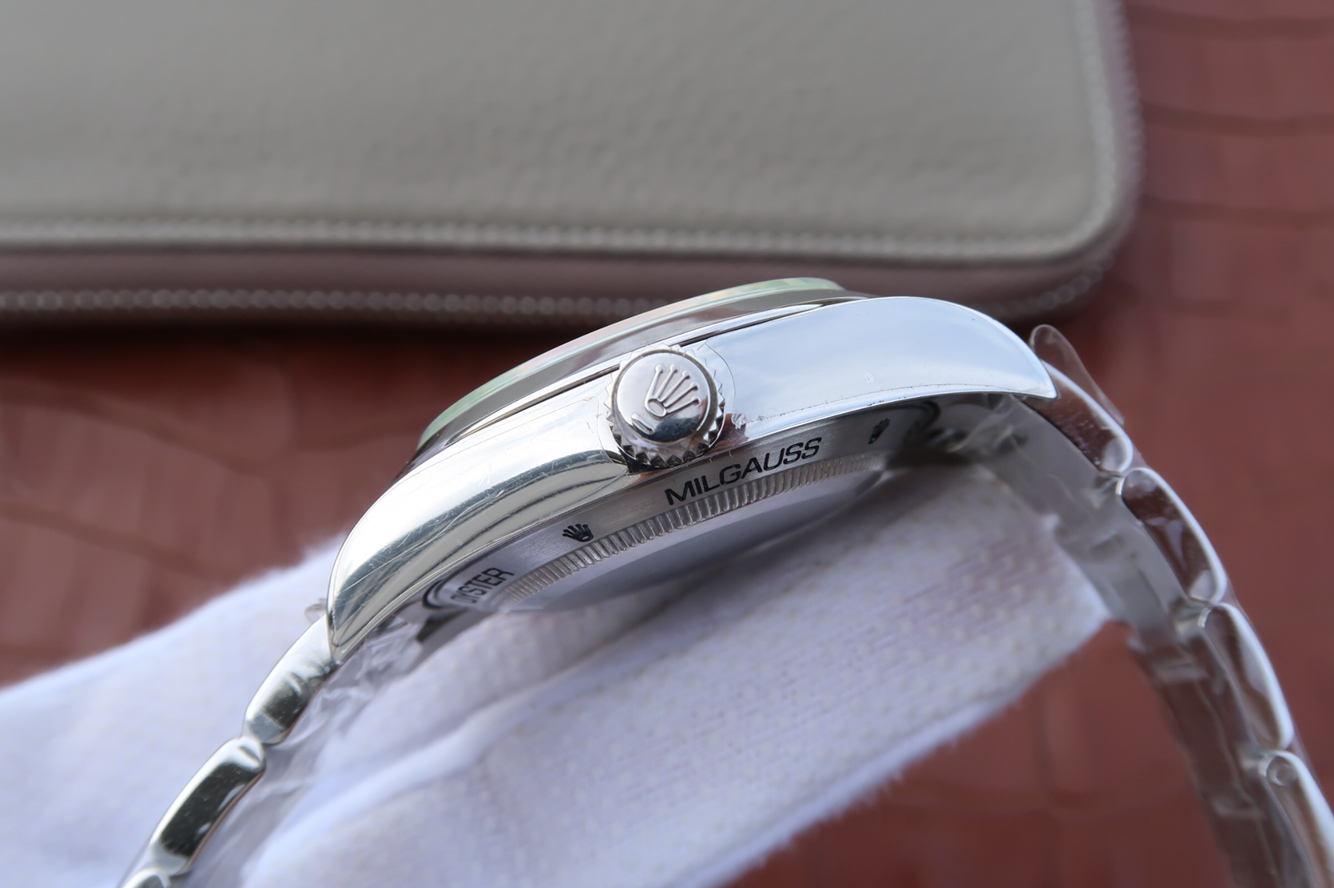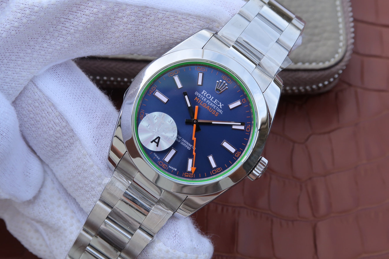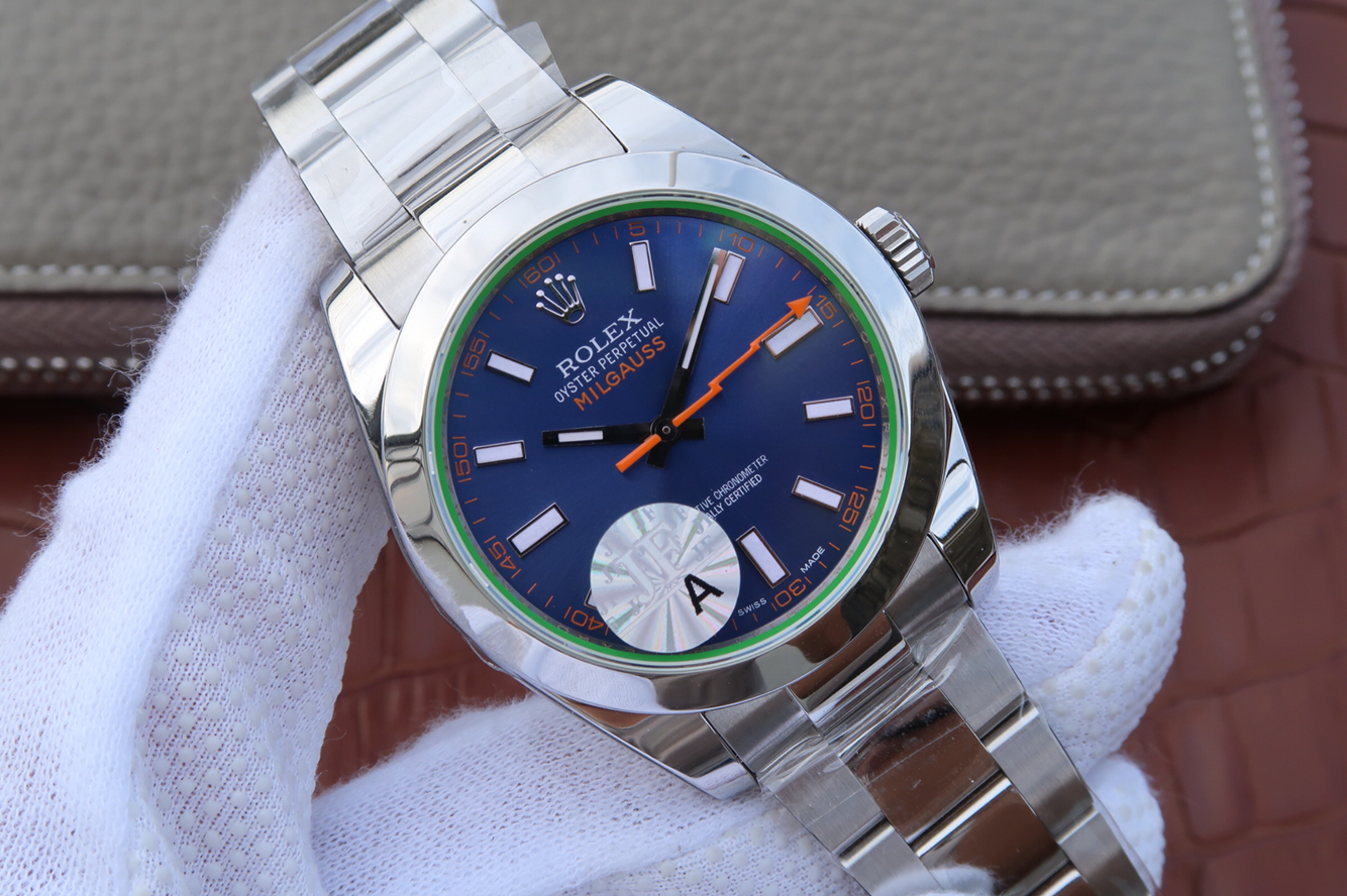 JF勞力士,型號:116400-GV-72400藍盤繫列:MILGAUSS款式:定制3131自動機械機芯,40毫米振頻:28,800每小時振蕩次數動力儲備:48小時外觀錶徑:40毫米錶殼材質:不銹鋼錶盤顏色:藍色錶盤形狀:圓形錶鏡材質:藍寶石水晶玻璃錶冠材質:不銹鋼錶帶顏色:銀色錶帶材質:不銹鋼錶扣材質:不銹鋼防水深度:100米
